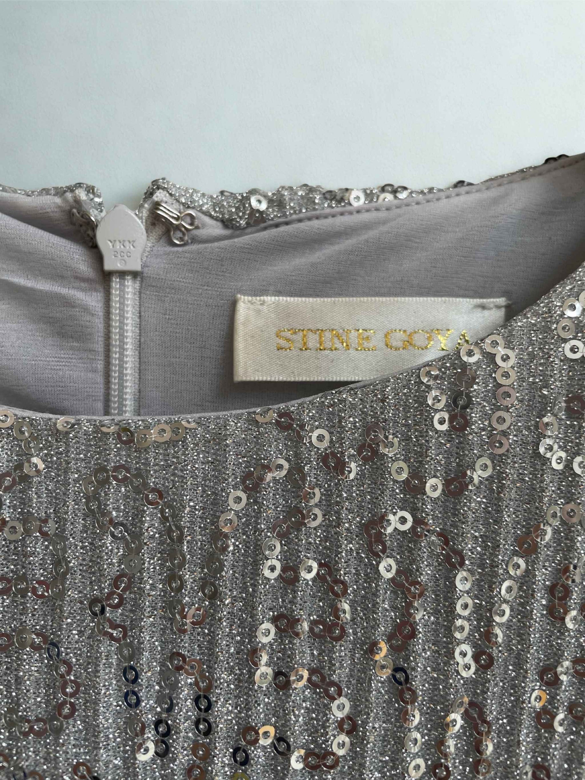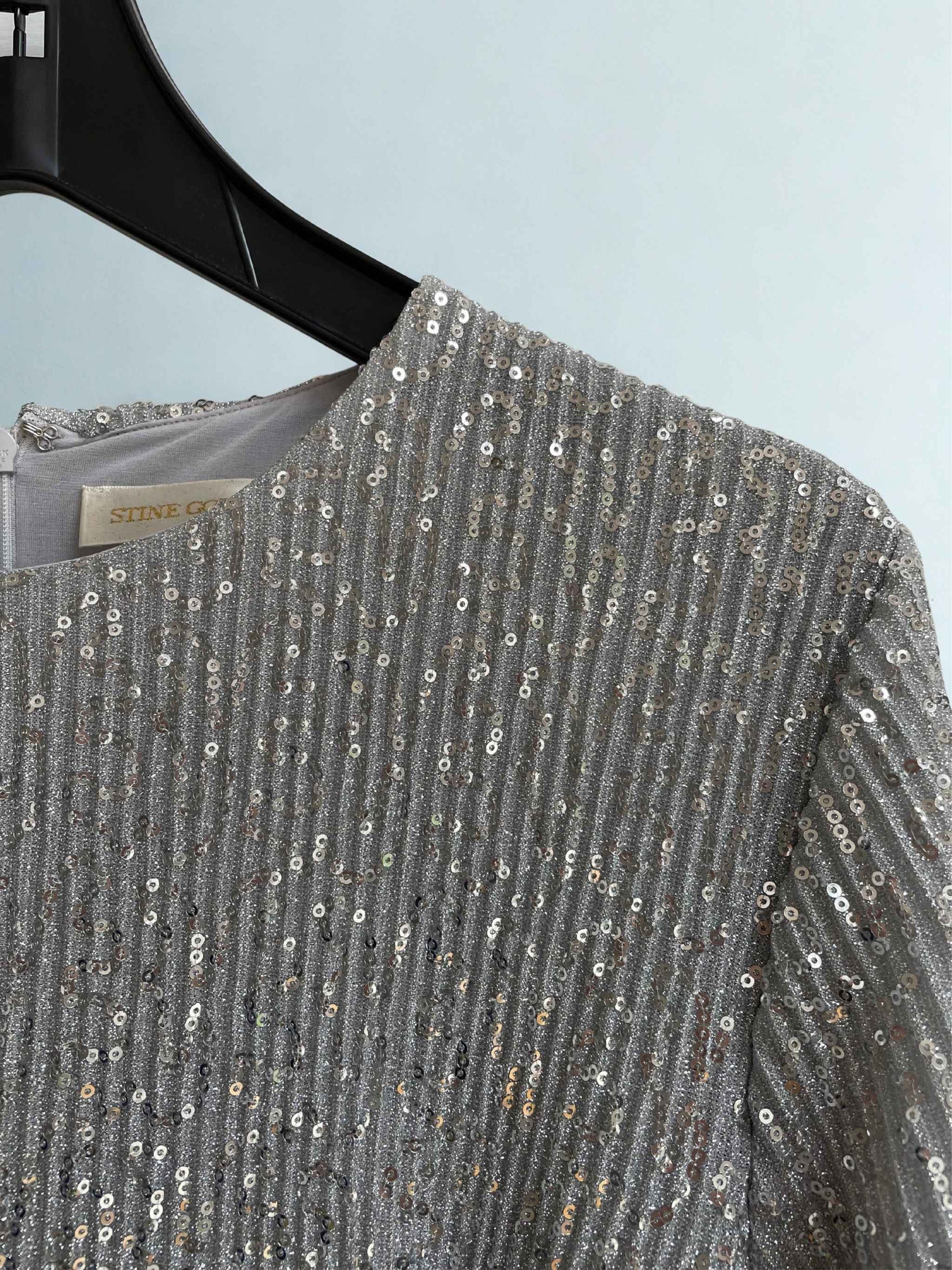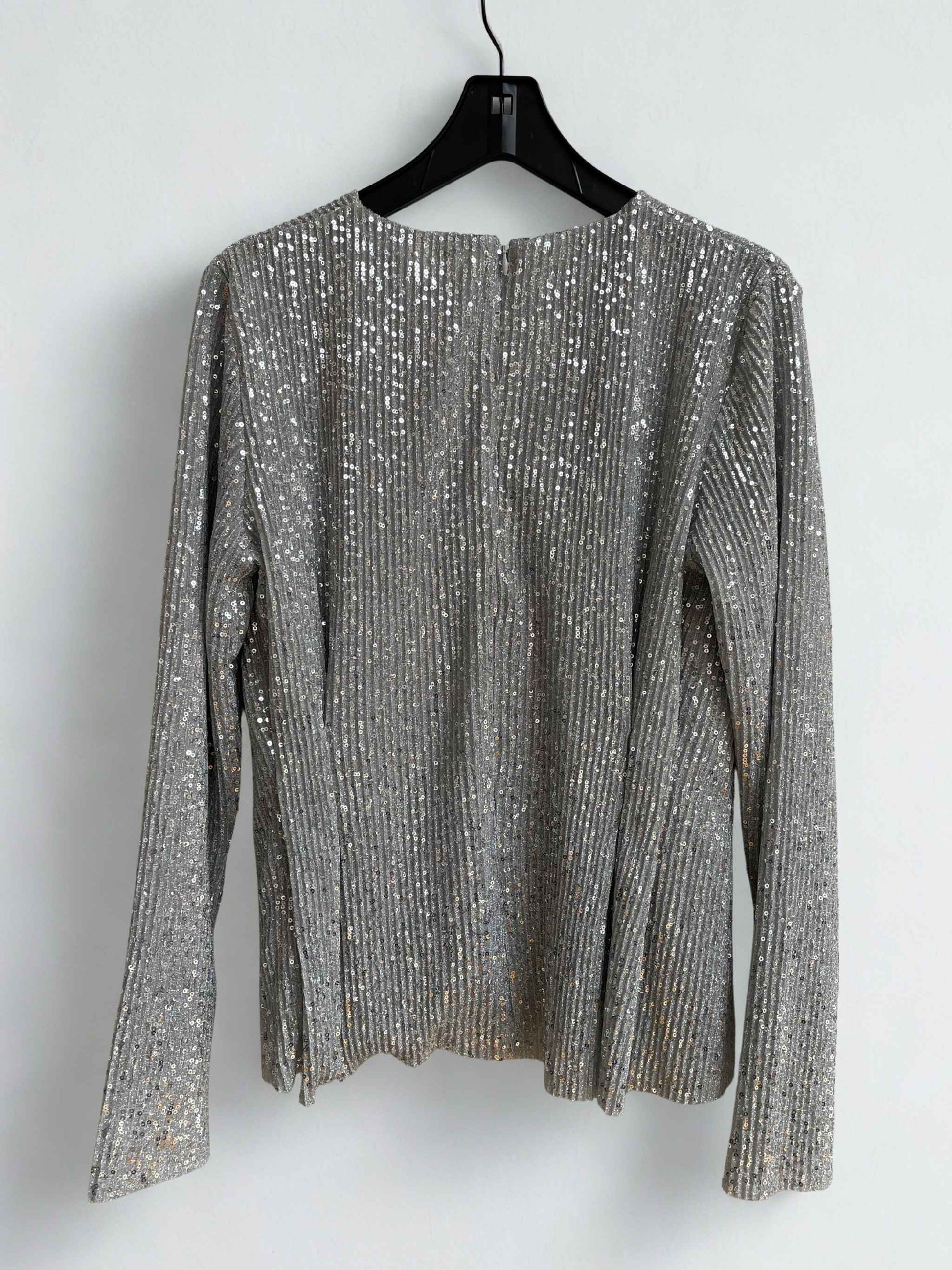 Such a gorgeous top! Peplum style with front pleats. Covered in silver sequins.